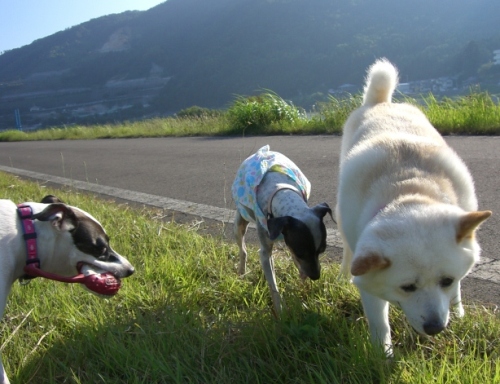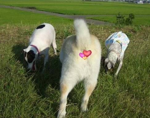 北海道で処分寸前に救出された「日本テリアに似たメス犬・パル」 2匹の先住犬「雑種・ゆり」と「日本テリア・みみ」、そしてパルの日常を、4枚の写真を使って4コママンガ風に紹介します。