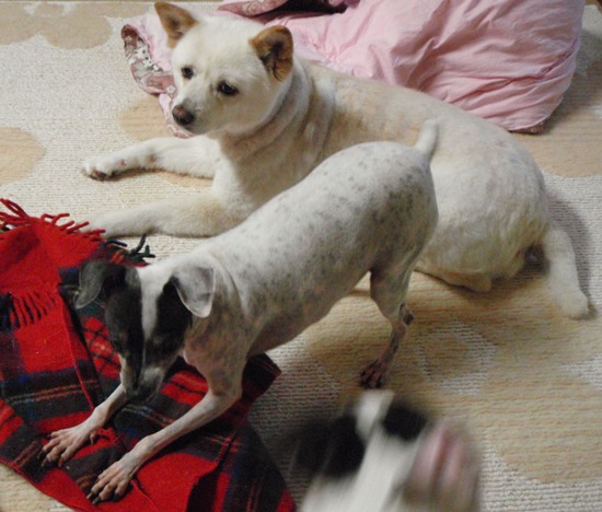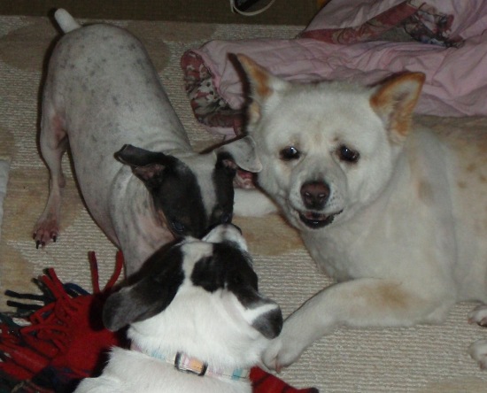 北海道で処分寸前に救出された「日本テリアに似たメス犬・パル」 2匹の先住犬「雑種・ゆり」と「日本テリア・みみ」、そしてパルの日常を、4枚の写真を使って4コママンガ風に紹介します。